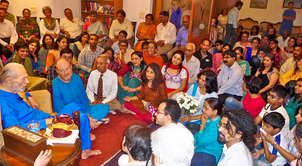 Guru Purnima, the full moon in July, is one of the most sacred days in the Indian calendar. An event was planned at the ashram, but the electric system blew out, so the location was changed to Swamiji’s living room. He was busy writing, and didn’t plan to attend. He came out, though, just to greet people and explain that his worship was to keep working on the lessons.