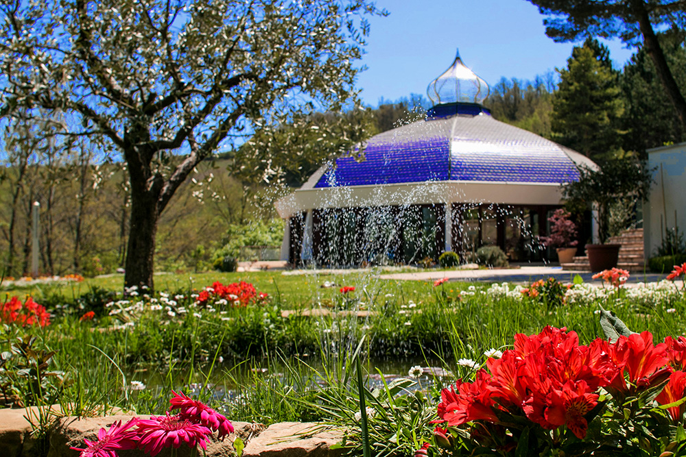This, then, was what I had envisioned in India: A dome enclosed within the lotus shape designed by Yogananda. During Ananda’s beginning, of course, I was forced to be cost-conscious (as, naturally, I’d have been also in India, once I faced the problems of actual construction). I still hope that Ananda will someday be able to test the idea of a gold-leafed lotus temple, based on our Guru’s original concept, along with my idea for a dome on the inside. Whether a lotus would be too imposing over a large dome, however, is a question to be considered carefully when the time comes to consider this idea seriously. Meanwhile, the Ananda temple in Italy expresses much of this concept, and very beautifully, with its transparent cupola on the top shaped in the form of a closed lotus. It is especially lovely when the cupola is lit from inside.